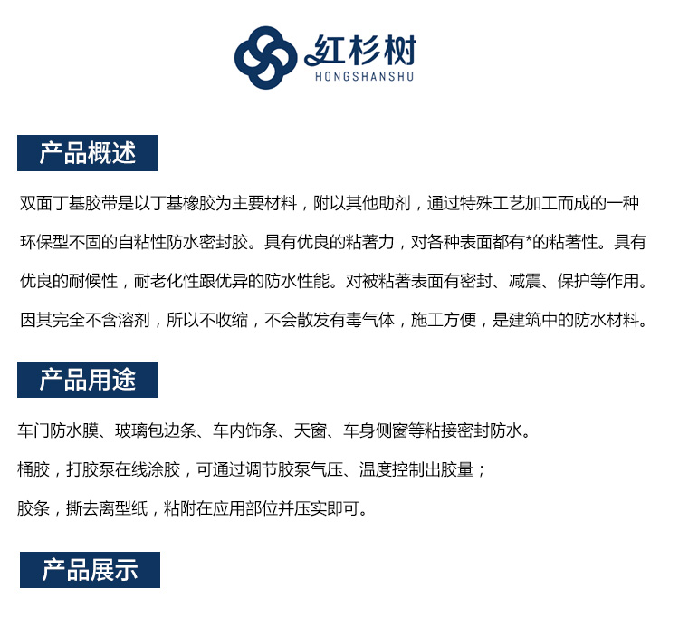 - 雙面丁基膠帶是以丁基橡膠為主要材料,附以其他助劑,通過特殊工藝加工而成的一種環(huán)保型不固的自粘性防水密封膠。具有優(yōu)良的粘著力,對各種表面都有*的粘著性。具有優(yōu)良的耐候性,耐老化性跟優(yōu)異的防水性能。對被粘著表面有密封、減震、保護等作用。因其完全不含溶劑,所以不收縮,不會散發(fā)有毒氣體,施工方便,是建筑中的防水材料。